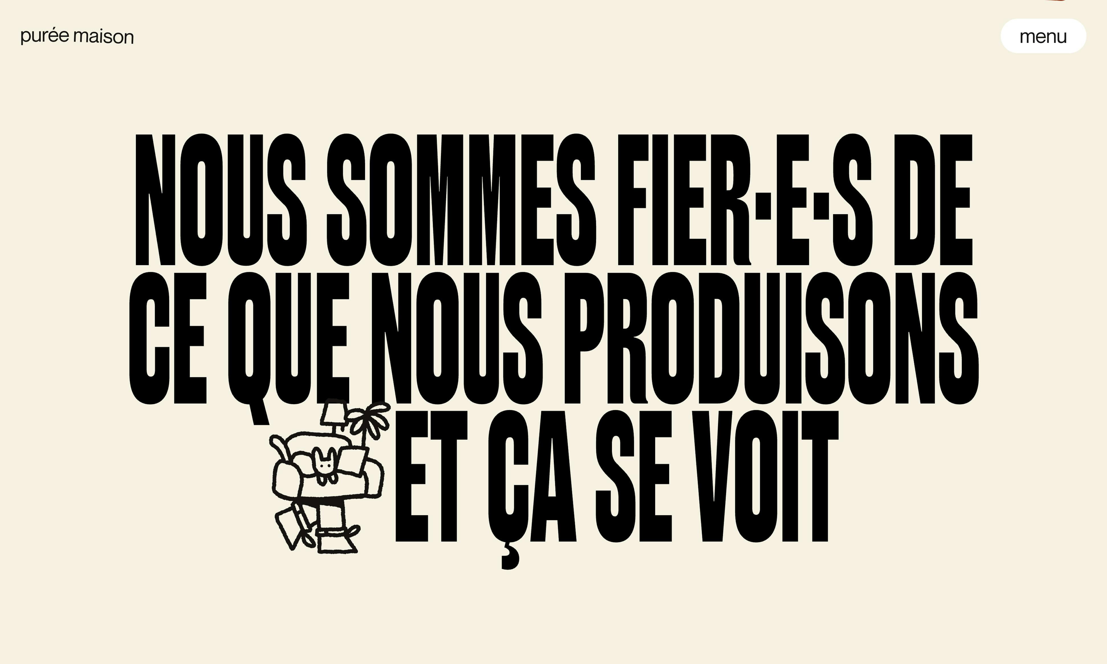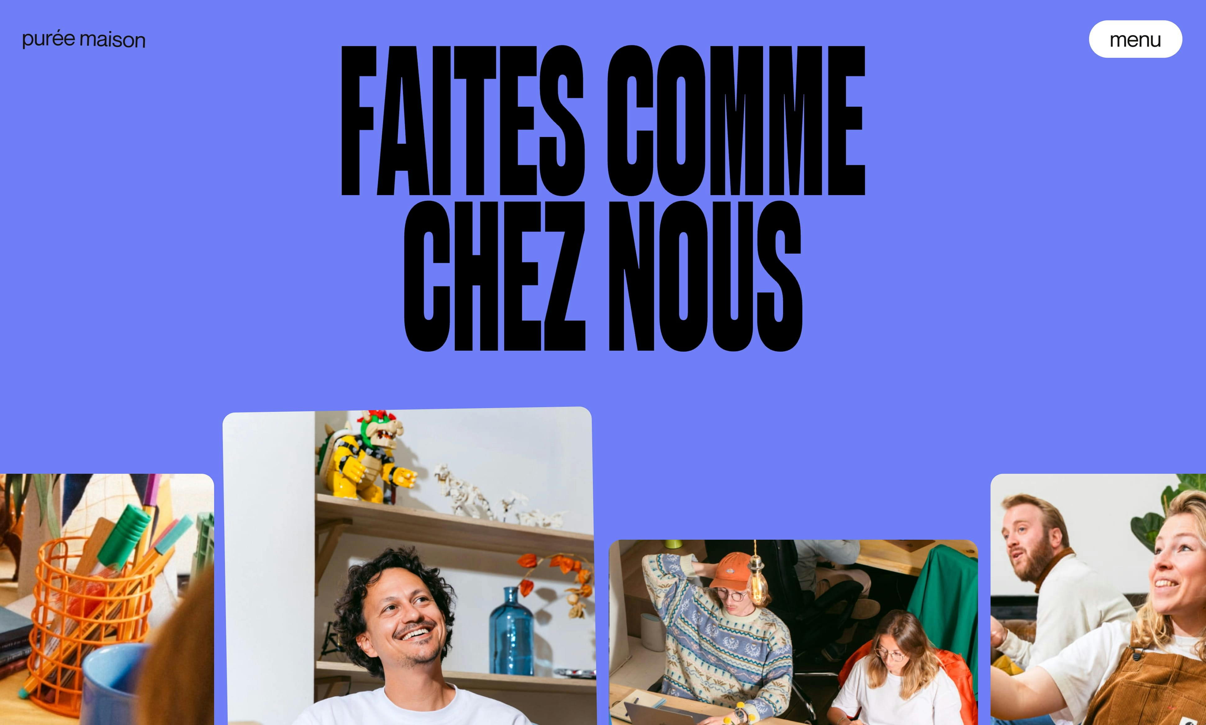 Purée Maison est une agence de communication créative qui conçoit des identités de marque et des expériences digitales fortes, notamment des sites vitrines et contenus éditoriaux/motion. Leur équipe pluridisciplinaire mise sur l’émulation, l’expérimentation et la diversité des profils pour nourrir la créativité. L’agence choisit de travailler avec des marques positives et progressistes, valorisées pour leur impact sur la communauté plutôt que pour leur budget.